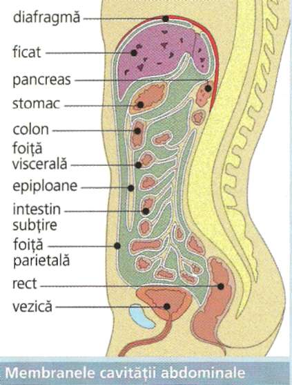 ► Peritoneul este membrana seroasă a cavităţii abdominale. Foiţa sa viscerală acoperă viscerele abdominale, în timp ce peritoneul parietal acoperă peretele abdominal şi faţa anterioară a diafragmei. Spaţiul dintre cele două foiţe ale peritoneului este cavitatea peritoneală, plină cu serozitate, în care sunt situate majoritatea organelor abdomenului. Totuşi, unele dintre ele se află între peritoneul parietal şi peretele abdominal posterior: în acest caz, sunt numite retroperitonea-le. Acesta este cazul rinichilor, al glandelor suprarenale, al duodenului, al intestinului subţire, al intestinului gros şi al unor porţiuni ale aortei abdominale şi venei cave inferioare.